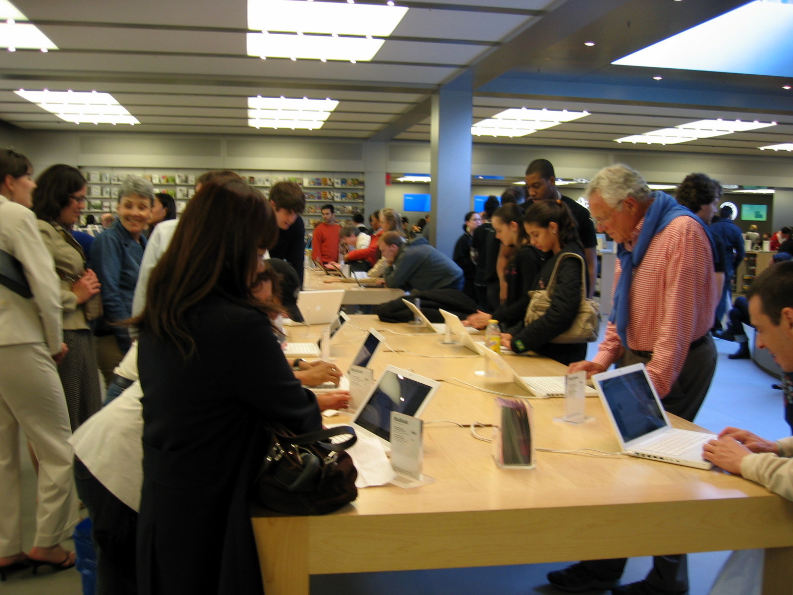 Look for a cool Apple sign in any prominent location. Follow it and you will enter a glass clad store with a big trendy posters on the walls and series of Macs, iPods and other Apple products. But one special thing to notice there is it looks more like a hangout place or a cyber cafe than a store. What you will see is lots of people standing around surfing the Web and playing with Apple products and accessories.